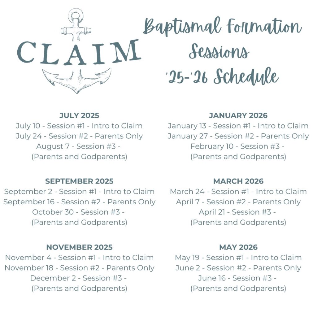 Claim is presented through (3) at-church sessions and supplemental at-home family meetings. This series runs each quarter throughout the year (July ‘24, October ‘24, January ‘25, March ‘25). Parents are encouraged to register for Baptism Preparation as early as the middle of the second trimester of pregnancy.