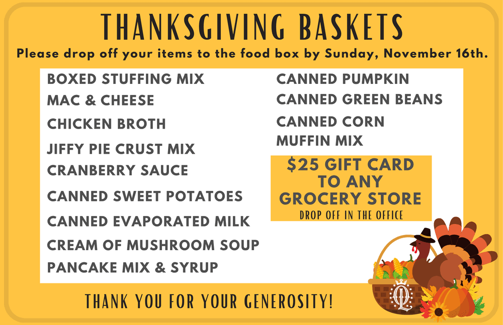 We’re collecting food donations to fill Thanksgiving Baskets for our neighbors in need. Please bring items from the list and drop them in the food box by the elevators by Sunday, November 16. Thank you for your generosity in helping provide a joyful and nourishing Thanksgiving meal for those in our community!