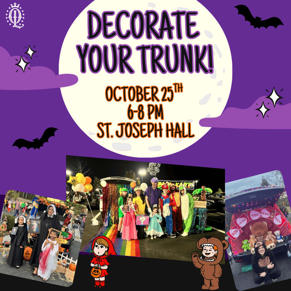 We are preparing for our annual Trunk or Treat on Saturday, October 25, from 6–8 PM in the St. Joseph Hall parking lot!