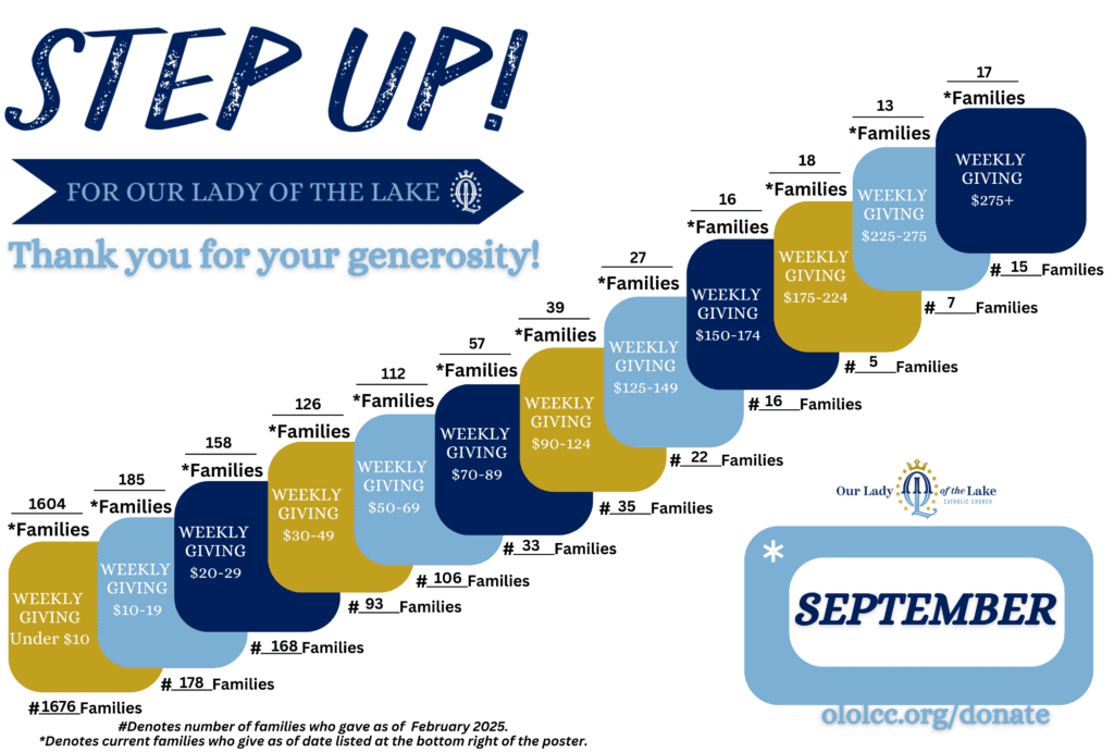 Through prayer, we invite you to consider increasing your giving by one or more steps to help meet the growing needs of Our Lady of the Lake. As our parish continues to thrive, it’s important that we plan for essential maintenance projects, such as roof repairs and HVAC upgrades, to ensure we can continue serving our community and advancing our mission.